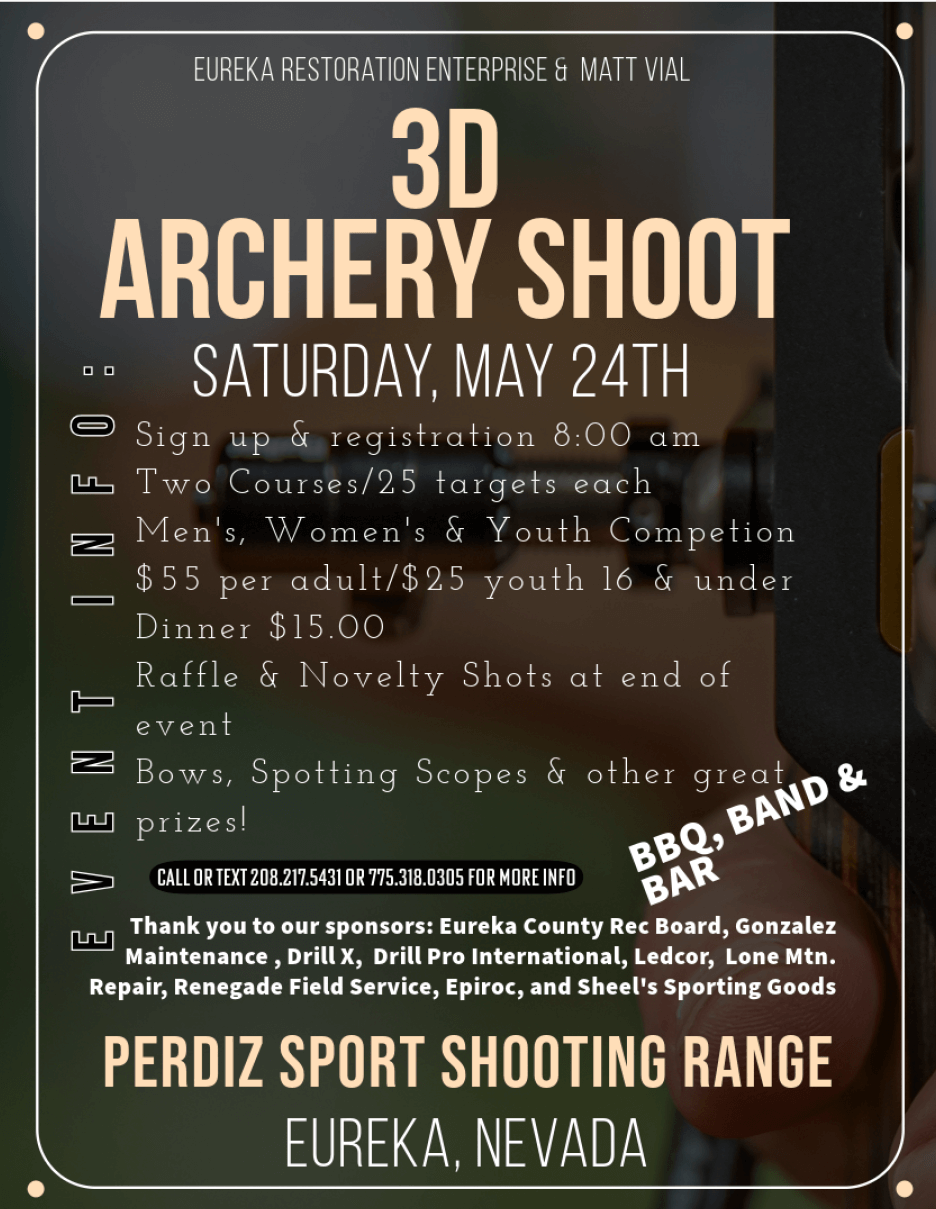 Perdiz Sport Shooting Range - Eureka, NV. Sign up & Registration 8 AM. $55 per adult, $25 youth 16 & under. Bows, spotting scopes, and other great prizes! Call or text 208-217-5431 OR 775-318-0305 for more info.