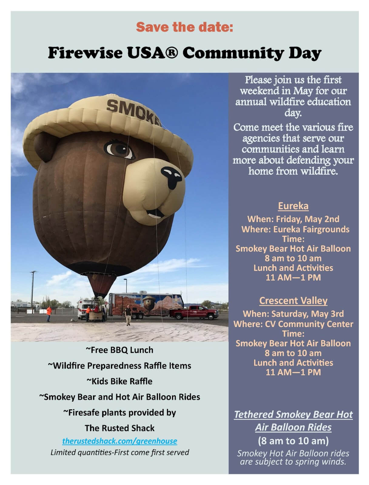 Friday May 2nd - Eureka Fairgrounds. Saturday May 3rd - CV Community Center. Free BBQ Lunch, Wildfire preparedness raffle items, Hot air balloon rides, and more!