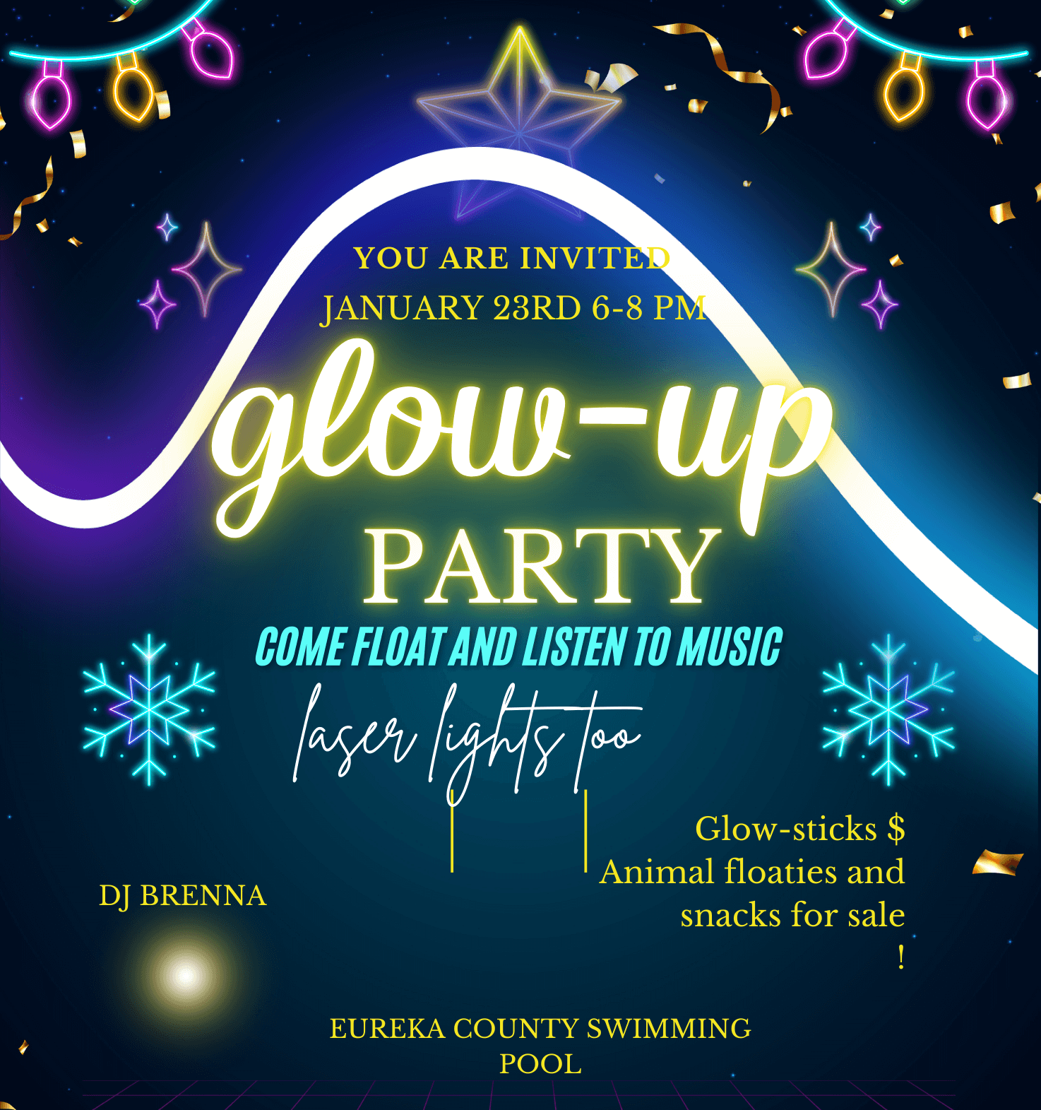 Eureka County Swimming Pool Pool party with music and food (open to all ages) For more info, contact Brenna at 775-217-2865 or 775-237-5316